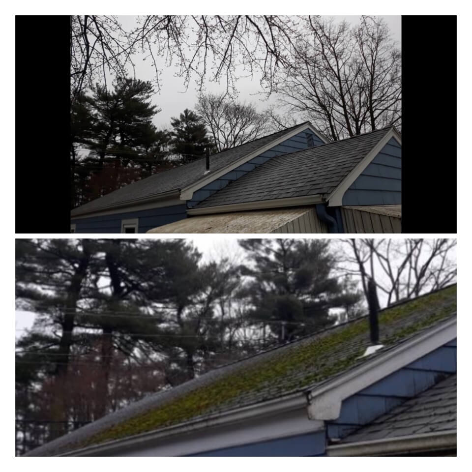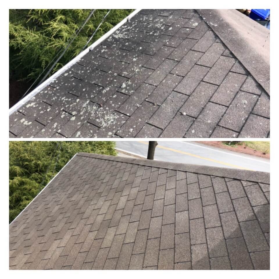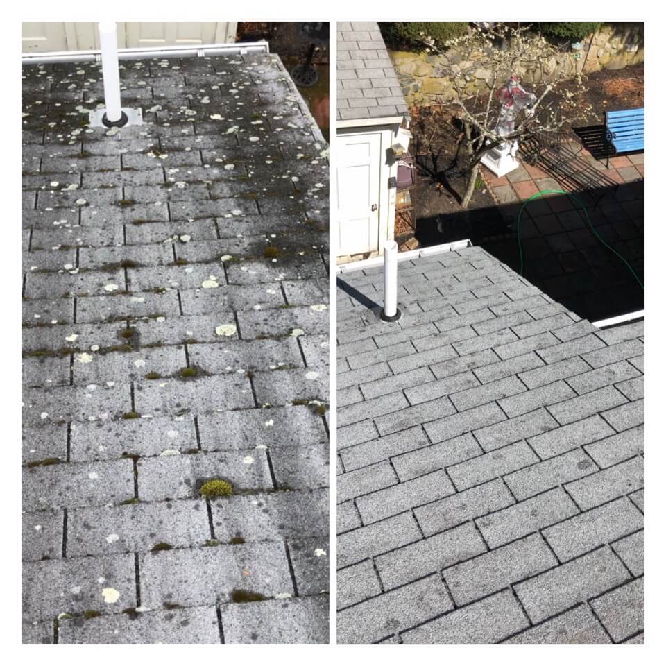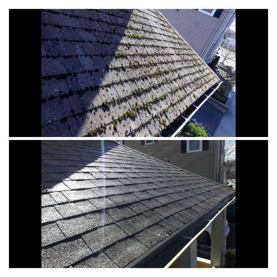 HiCleaners is the most experienced company in Wellesley, MA that deals with roof washing and roof soft washing. All of our employees are trained to recognize precise solution mixing ratios to provide you with the safest and most effective soft washing service. Roofs are a commonly neglected part of a house due to the fact that most people don’t have ladders to access it, so it is very easy to just leave it alone and forget about problems that may start to arise. Just like many home owners, discoloration and small bits of moss on a roof can be overlooked because of the misconception that it is just aesthetic. However, it isn’t just aesthetic, the moss slowly lifts the granules off the shingles which in turn shorten the life of the shingle. The moss also spreads, just like any bacteria if it is left alone for too long, it can quickly become a problem that spirals out of control. Call HiCleaners for a free quote, we only use the most advanced eco-friendly solutions and equipment to make sure the job is done right, for the safety of the employees, your plants, grass, pets, and children.