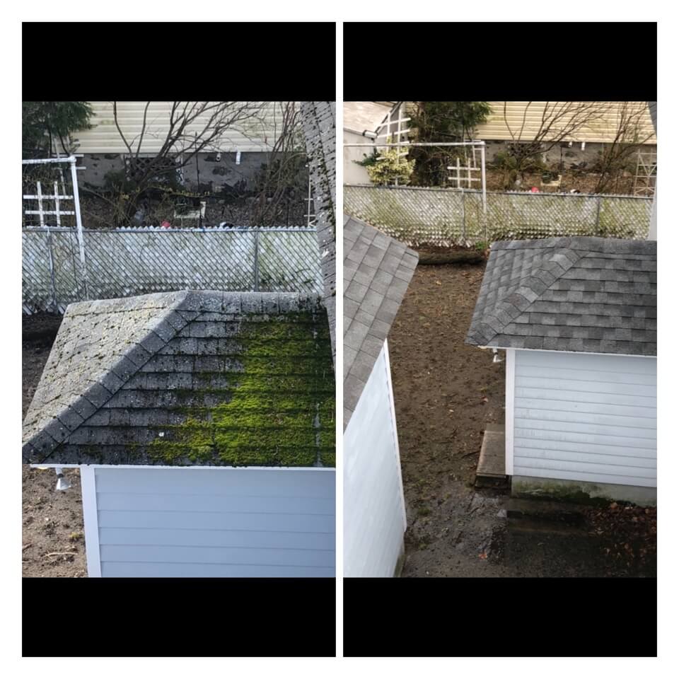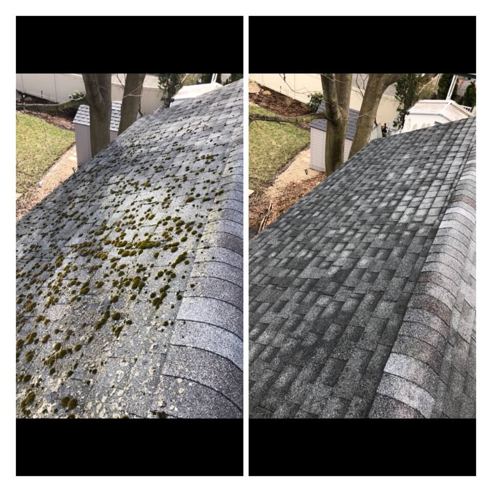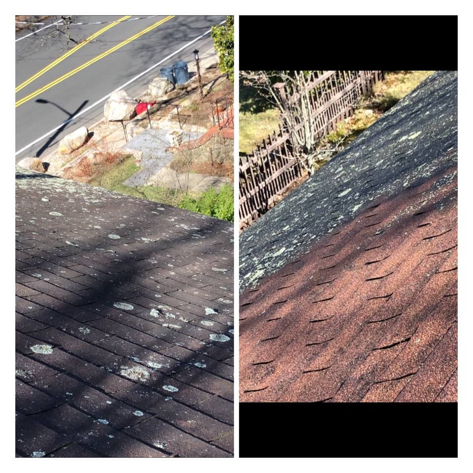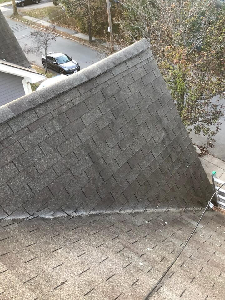HiCleaners is the most experienced company in Wellesley, MA that deals with roof washing and roof soft washing. All of our employees are trained to recognize precise solution mixing ratios to provide you with the safest and most effective soft washing service. Roofs are a commonly neglected part of a house due to the fact that most people don’t have ladders to access it, so it is very easy to just leave it alone and forget about problems that may start to arise. Just like many home owners, discoloration and small bits of moss on a roof can be overlooked because of the misconception that it is just aesthetic. However, it isn’t just aesthetic, the moss slowly lifts the granules off the shingles which in turn shorten the life of the shingle. The moss also spreads, just like any bacteria if it is left alone for too long, it can quickly become a problem that spirals out of control. Call HiCleaners for a free quote, we only use the most advanced eco-friendly solutions and equipment to make sure the job is done right, for the safety of the employees, your plants, grass, pets, and children.